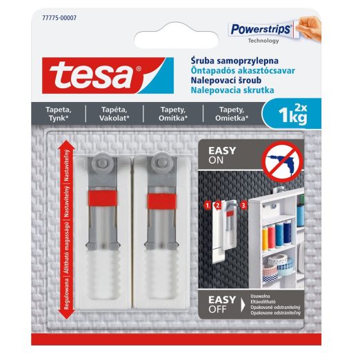 A tesa® tapétán, vakolaton és festett falon használható, 1 kg teherbírású állítható öntapadós akasztócsavarjával texturált és érzékeny felületeken rögzíthet tárgyakat. Katalóguskód: 47029