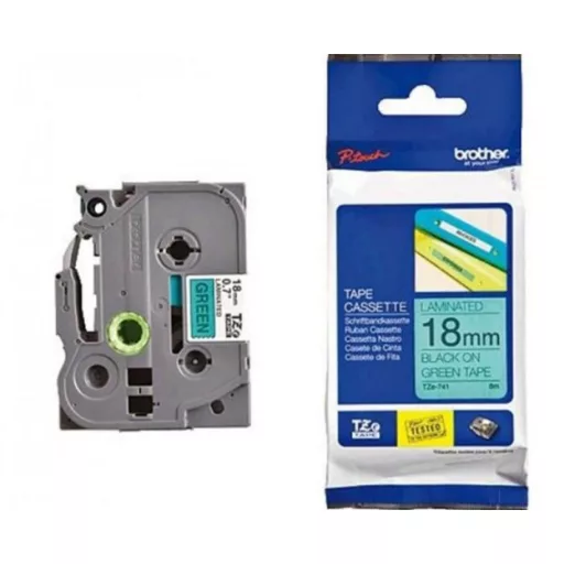 **TZe -741 öntapadós laminált címkeszalag tartós feliratok nyomtatásához.** * Szalag típusa: Standard laminált * Szalag szélessége: 18 mm * Szalag hossza: 8 m * Szalag színe: Zöld * Felirat színe: Fekete