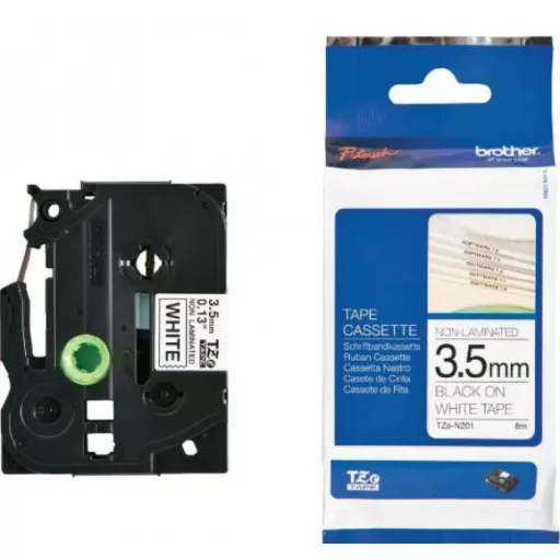 **TZe -N201 öntapadós címkeszalag NEM laminált feliratok nyomtatásához.** * Slim tokos CD / DVD lemezek feliratozásához ajánlott. * Szalag típusa: NEM laminált * Szalag szélessége: 3,5 mm * Szalag hossza: 8 m * Szalag színe: Fehér * Felirat színe: Fekete