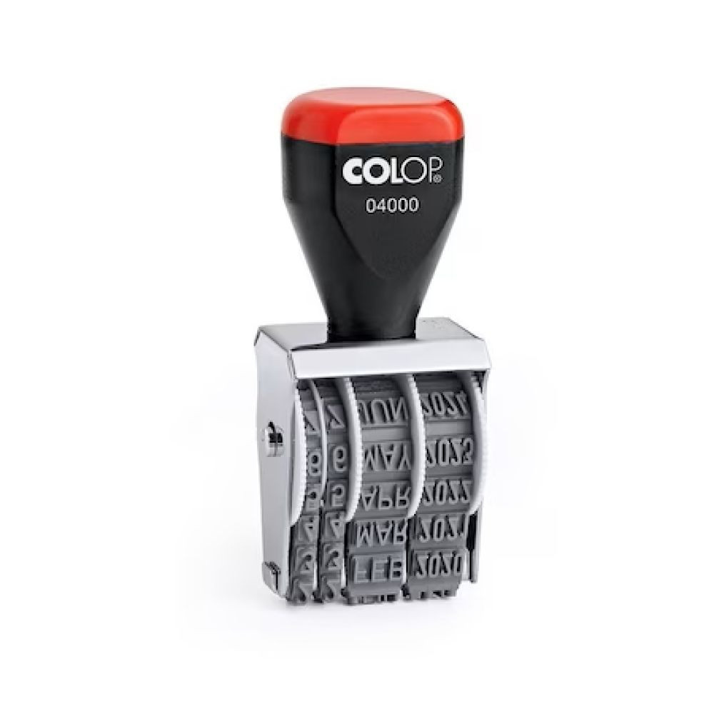 COLOP 04000 szalagos dátumbélyegző: Hagyományos dátumbélyegző év/hónap/nap dátumformátummal. A karakterek 4 mm magasak. Katalóguskód: 37656