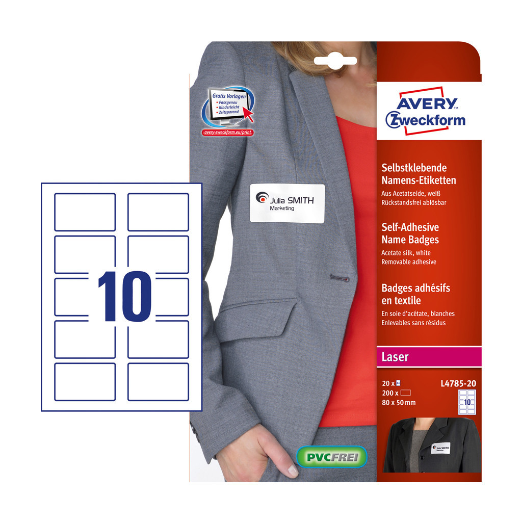 Öntapadó, visszaszedhető, lézernyomtatókhoz kifejlesztett névcímkék nagyszerű segítséget nyújtanak a konferenciákhoz és rendezvényekhez. Az acetátselyem névcímkék megbízhatóan tapadnak ruhákon és textíliákon, ugyanakkor egyszerűen, ragasztómaradvány nélkül eltávolíthatóak a ruházat megóvása mellett. Könnyedén leválasztható és újra visszahelyezhető, tárolható a hordozón a következő használatig. Tervezze meg az arculatot és nyomtassa ki a nevét gyorsan és egyszerűen - az ingyenes szoftverünkért és sablonjainkért látogasson el a http://www.avery.hu/templates-software/ weboldalra.