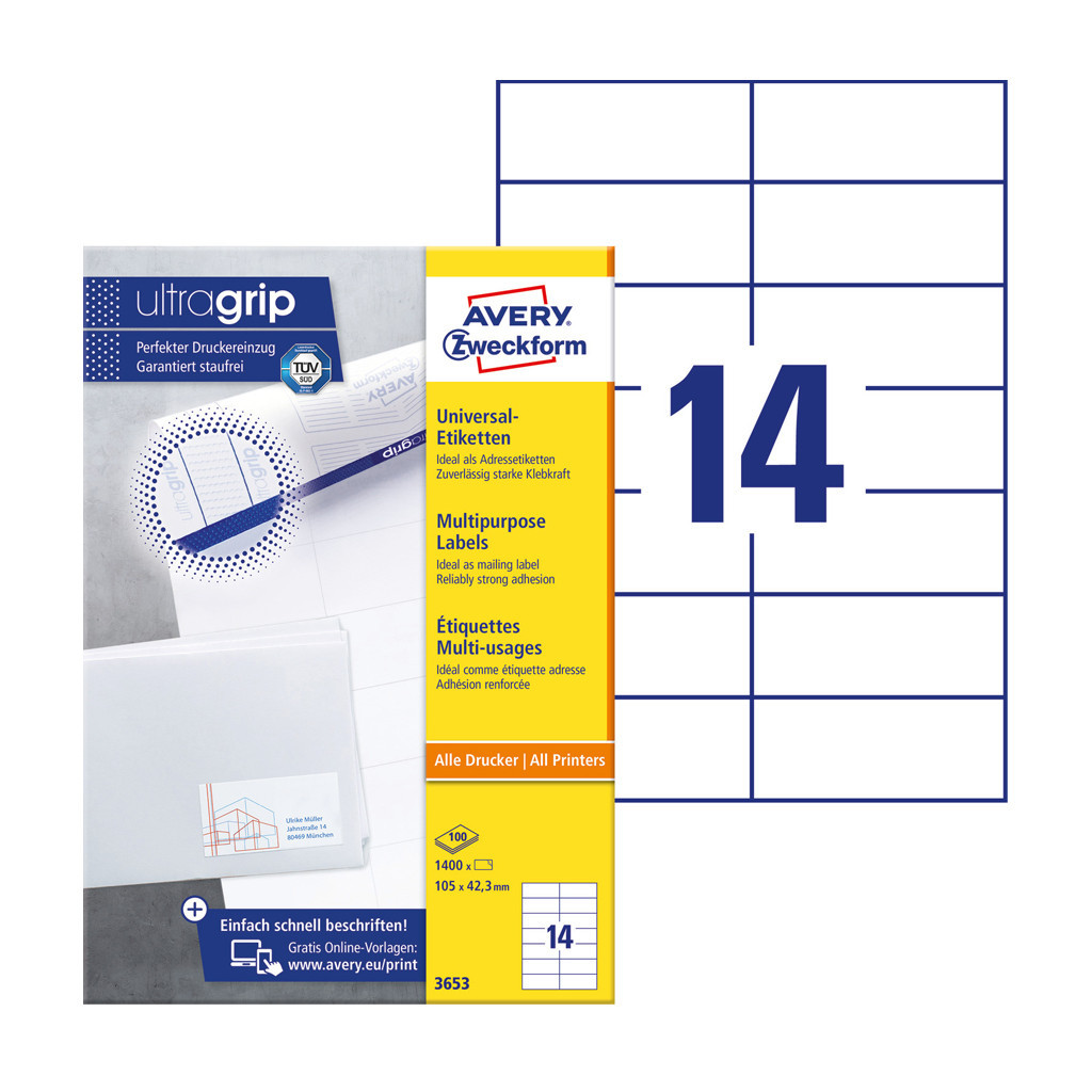 Címke mérete: 105 x 42,3 mm Doboz tartalma: 1400 darab címke - 100 ív/doboz (14 címke/lap) Tökéletesen alkalmasak például dobozok tartalmának feltüntetésére, készletinformáció és egyéb célból. Biztos lehet az elakadásmentes nyomtatásban, hiszen ragasztómaradvány nem kerül a nyomtatóba. Extra erős tapadás: a címkék meggyőző erővel tapadnak papírra, kartonra, üvegre és műanyagra egyaránt. Tökéletes pl. borítékokra, csomagokra, iratrendezőkre vagy fóliákra. Az univerzális etikettek minden igényt kielégítőek, tűéles képeket, kiváló toner tapadást és elkenődésmentes felületet biztosítanak. Környezetbarát, FSC® minősítésű és klórmentes eljárással fehérített. Tervezze meg és nyomtassa ki címkéit gyorsan és egyszerűen - ingyenes szoftverünkért és sablonjainkért látogasson el a http://www.avery.hu/templates-software/ weboldalra vagy használja a Microsoft® Office csomagokba beépített sablonjainkat! Optimalizált minőség tintasugaras, lézer és színes lézer nyomtatókhoz, fénymásolókhoz. Katalóguskód: 25263