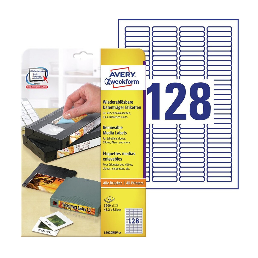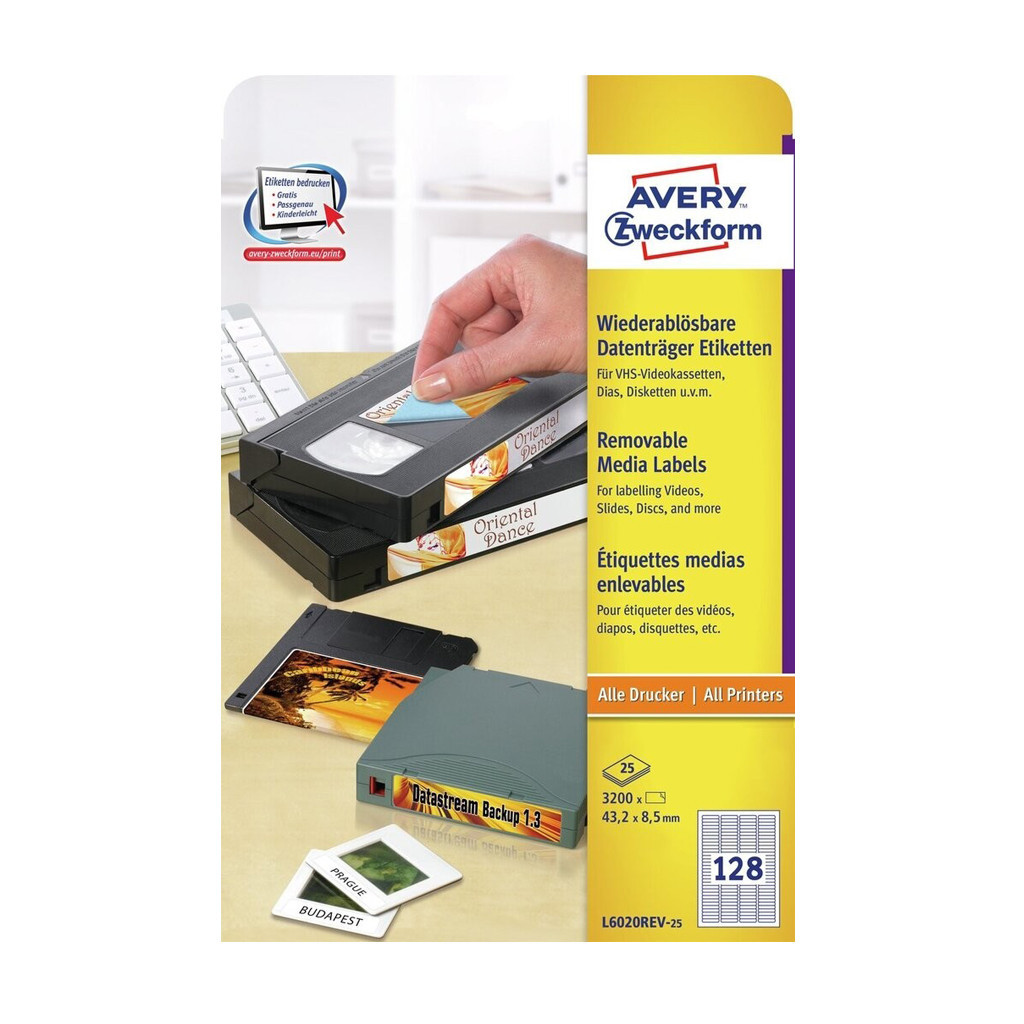 Az Avery Zweckform L2020REV-25 cikkszámú fehér, visszaszedhető, 43,2x8,5 mm méretű diacímke tökéletes a diák ideiglenes felcímkézéséhez. A 3200 db címke 25 íven, megbízhatóan tapad ugyanakkor ragasztómaradvány nélkül eltávolítható. Környezetbarát, FSC® minősítésű és klórmentes eljárással fehérített. Tervezze meg és nyomtassa ki diacímkéit könnyen és gyorsan - ingyenes sablonokért és az Avery® Design&Print online szoftverért látogasson el a www.avery.hu/szoftver weboldalra. Minden ismert hagyományos tintasugaras és lézer nyomtatóval nyomtatható és fénymásolható. Katalóguskód: 26395