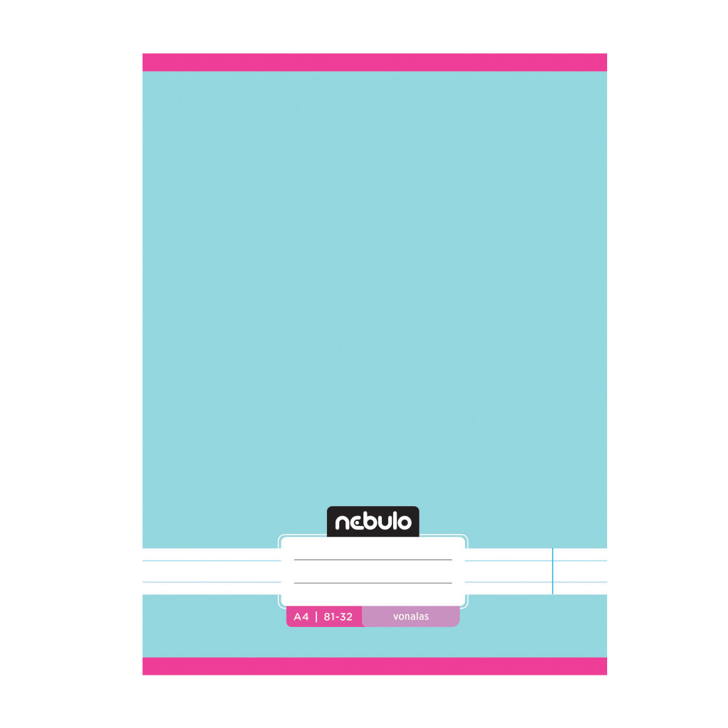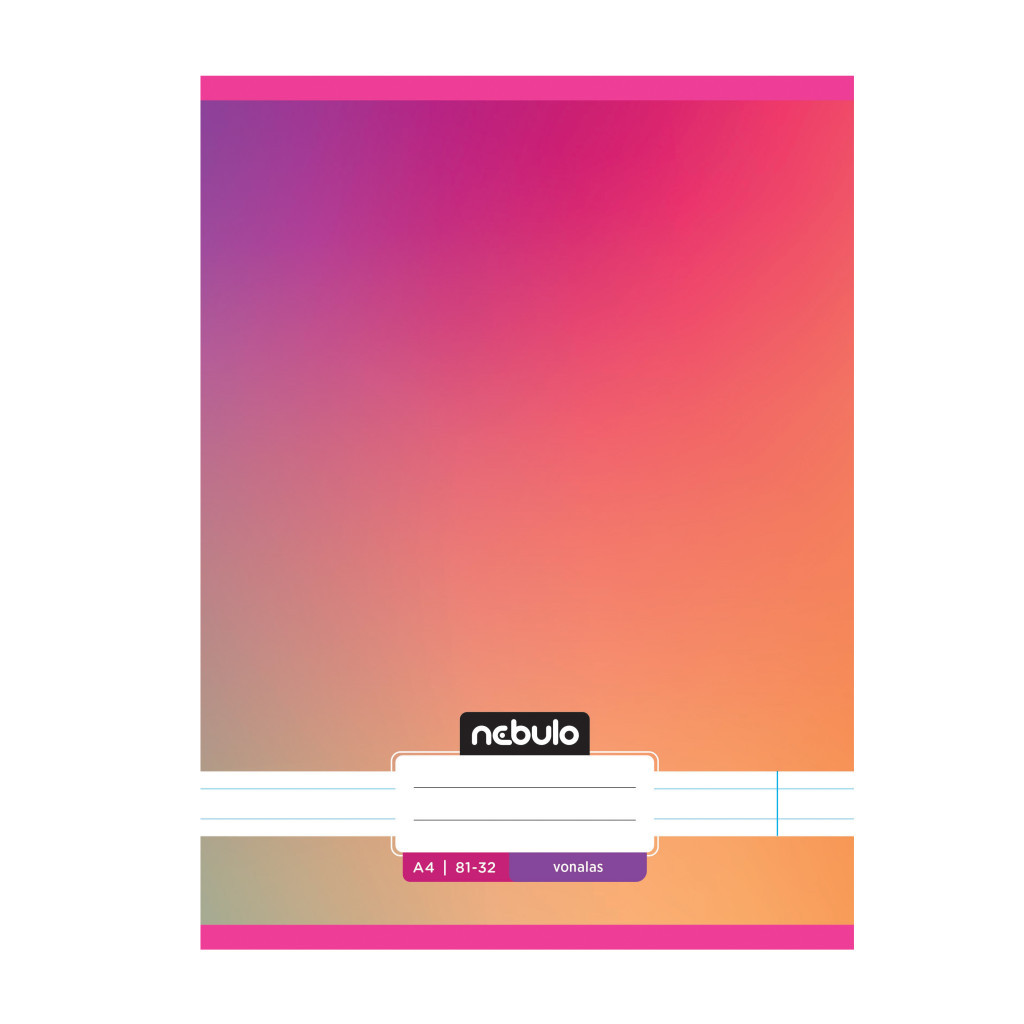A/4-es tűzött iskolai vonalas füzet, 32 lapos (81-32). 12 db füzet (6 különböző minta: Monochrome=egyszínű, Gradient=színátmentes, 2db / minta) van egy csomagban. 70 g-os füzetlapok és 200 g-os műnyomó borító fényes fóliával.