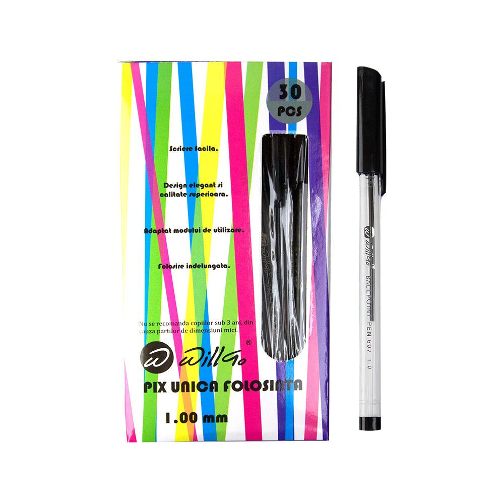 Eldobható, kupakos golyóstoll átlátszó, műanyag testtel. A kupak színével megegyező tinta