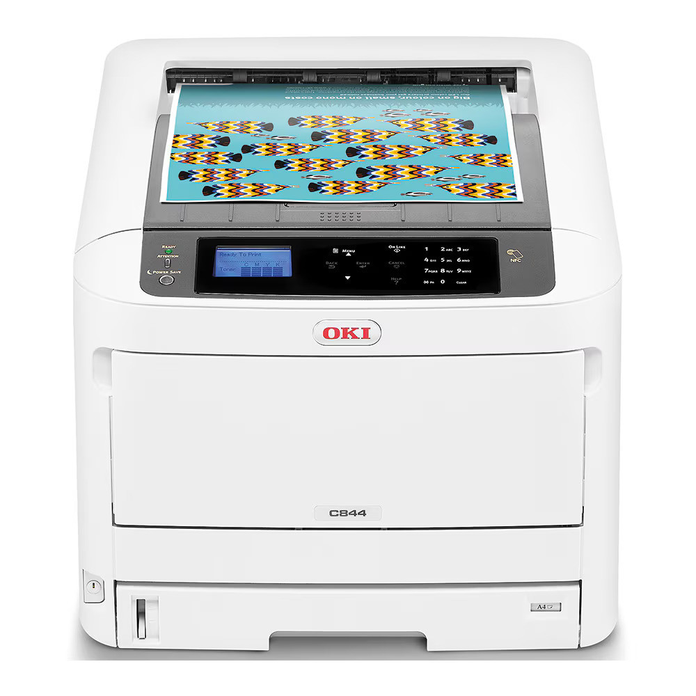 **Oki C844DNW A3 Színes Nyomtató** * A3 LED Színes nyomtató * A4: 36 lap/perc, A3: 20 lap/perc * Első nyomat: 6,3 mp * Duplexes, Hálózatos, NFC * 1200x1200 dpi * 300 lap+100 lapos kézi * PCL6, PCL5c, PS3, PDF v1,7 * 1 GB RAM + 3 GB eMMC * USB, Előlapi USB, Gigabit hálózat, WLAN (Wireless direct), NFC * Terhelhetőség: Max:75.000 lap/hó * Max papírsúly: 256g * OPCIÓK: 4*535 lapos papírtálca (47074403), Banner papírtálca (45015702), Gépszekrény (01321101), Pedestal alj (45889502), Wifi (45830202), IC olvasó tartó (46539501) * KELLÉKEK: * Toner induló: 2.5K * 5K: Cyan-47095703, Magenta-47095702, Yellow-47095701, Black-47095704 * 10K: Cyan-46861307, Magenta-46861306, Yellow-46861305, Black-46861308 * Drum 30K: Cyan-46857507, Magenta-46857506, Yellow-46857505, Black-46857508 * Transfer belt 80K: 47074503 * Fuser Unit 100K: 47219604 * Garancia 1+2 év regisztráció esetén
